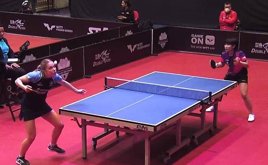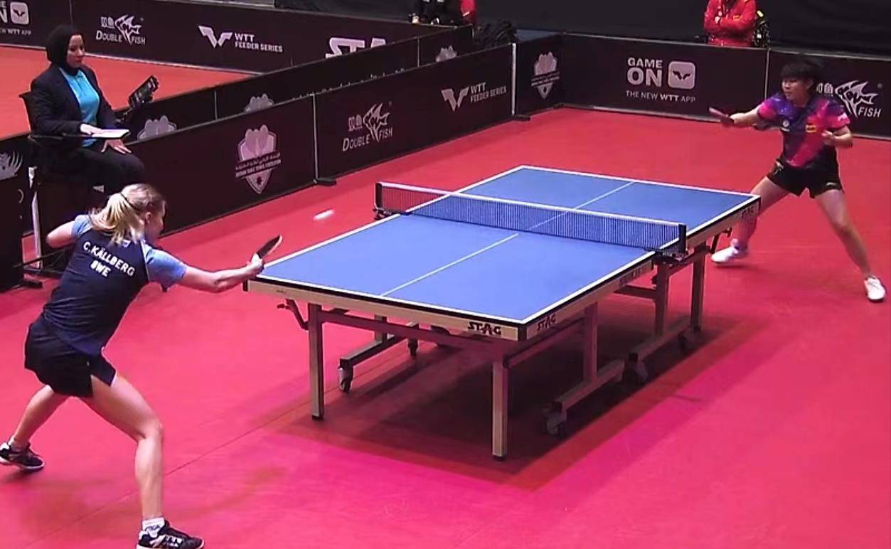WTT支线赛安曼站,女单1/16决赛,国乒17岁的小将覃予萱vs瑞典球员克里斯蒂娜-卡尔伯格。